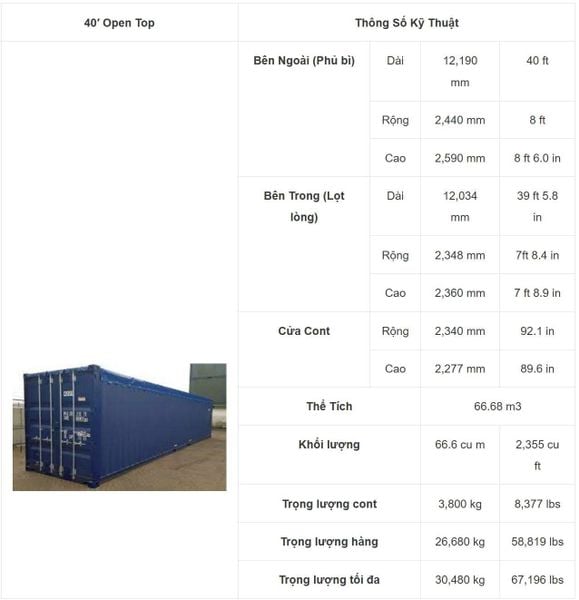 Loại container 40 feet Open Top được thiết kế các thông số kỹ thuật giống với 40 thường như container hở nóc và nóc được làm bằng bạt. Tác dụng như 20 open top.