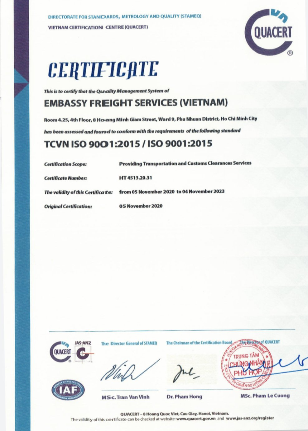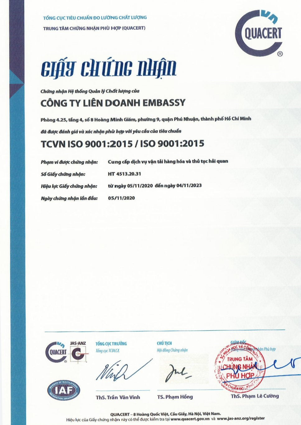EMBASSY FREIGHT SERVICES (VN) Vinh Dự Đạt Chứng Nhận TCVN ISO 9001:2015 / ISO 9001:2015